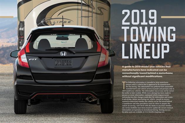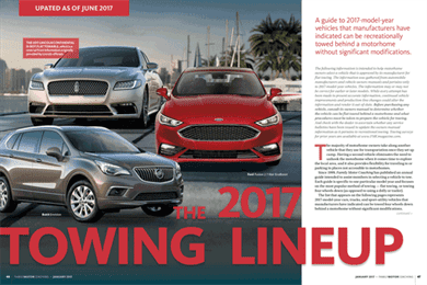 Family RVing magazine's annual compilations of cars, trucks and SUVs that have been approved by their manufacturers for flat towing behind a motorhome. (You must be signed in as an FRVA member or Family RVing magazine subscriber to access the Towing Guides.)